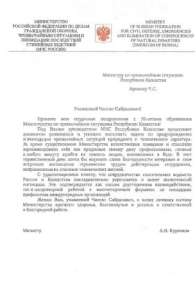 Уважаемый Чингис Сайранович! Примите мои сердечные поздравления с 30-летием образования Министерства по чрезвычайным ситуациям Республики Казахстан!