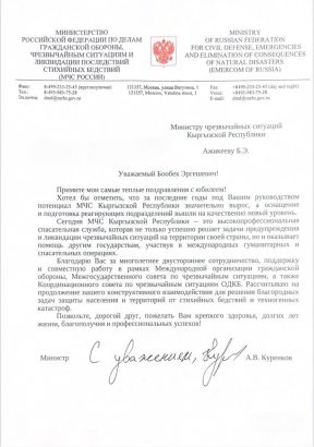 Глава МЧС России Александр Куренков поздравил с юбилеем Министра чрезвычайных ситуаций Кыргызской Республики Бообека Ажикеева